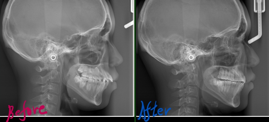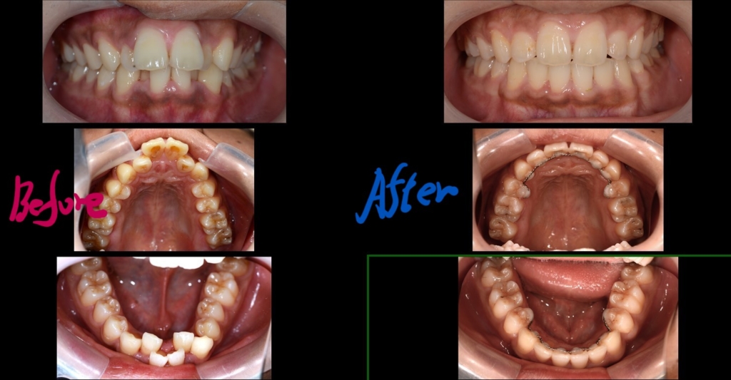 特に、飛び出ているように見える上の前歯の唇側傾斜を、可及的に直立させるよう意識しました。